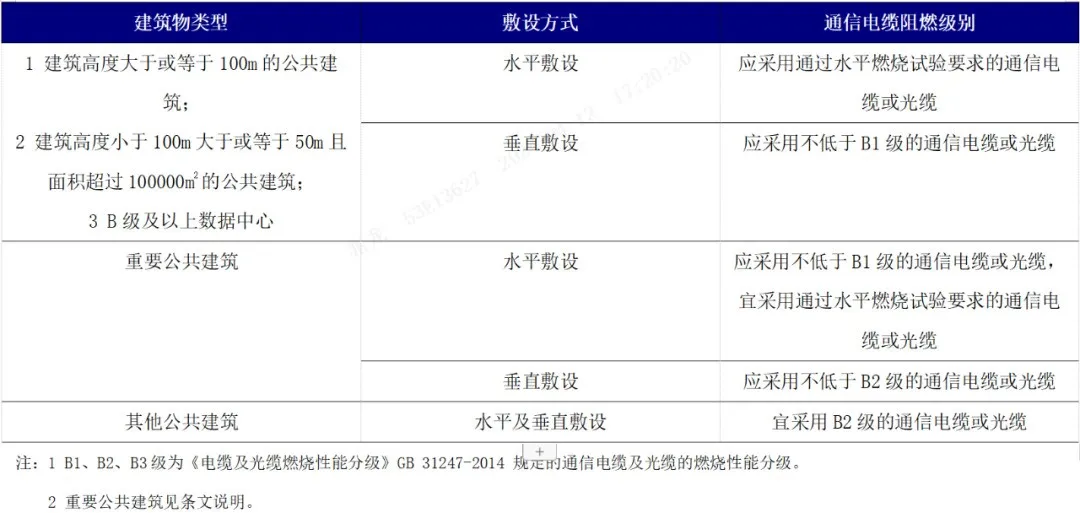根据 GB 51348-2019 《民用建筑电气设计标准》第 13.9.3 条,综合布线系统的通信电缆和光缆应根据建筑物的重要性,选择相应燃烧性能等级的通信电缆和光缆,并应符合下表中的规定。